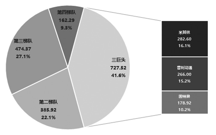 圖為2022年全球輪胎銷售份額(單位:億美元)